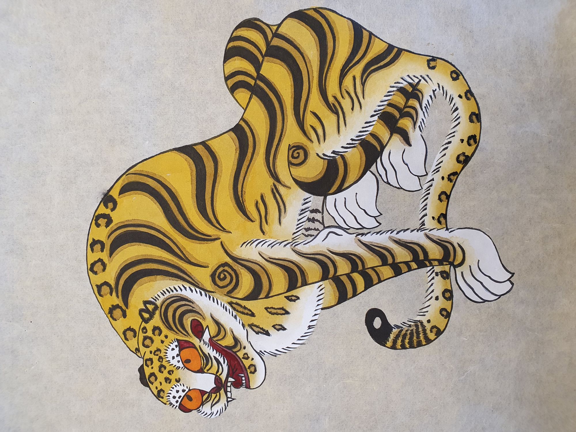 An introduction to Korean traditional folk paintings. Koreans believe that the tiger is a guardian animal that drives away evil spirits and brings good fortune. Let's hang the finished picture of a tiger next to the gate to bring good luck in the new year.