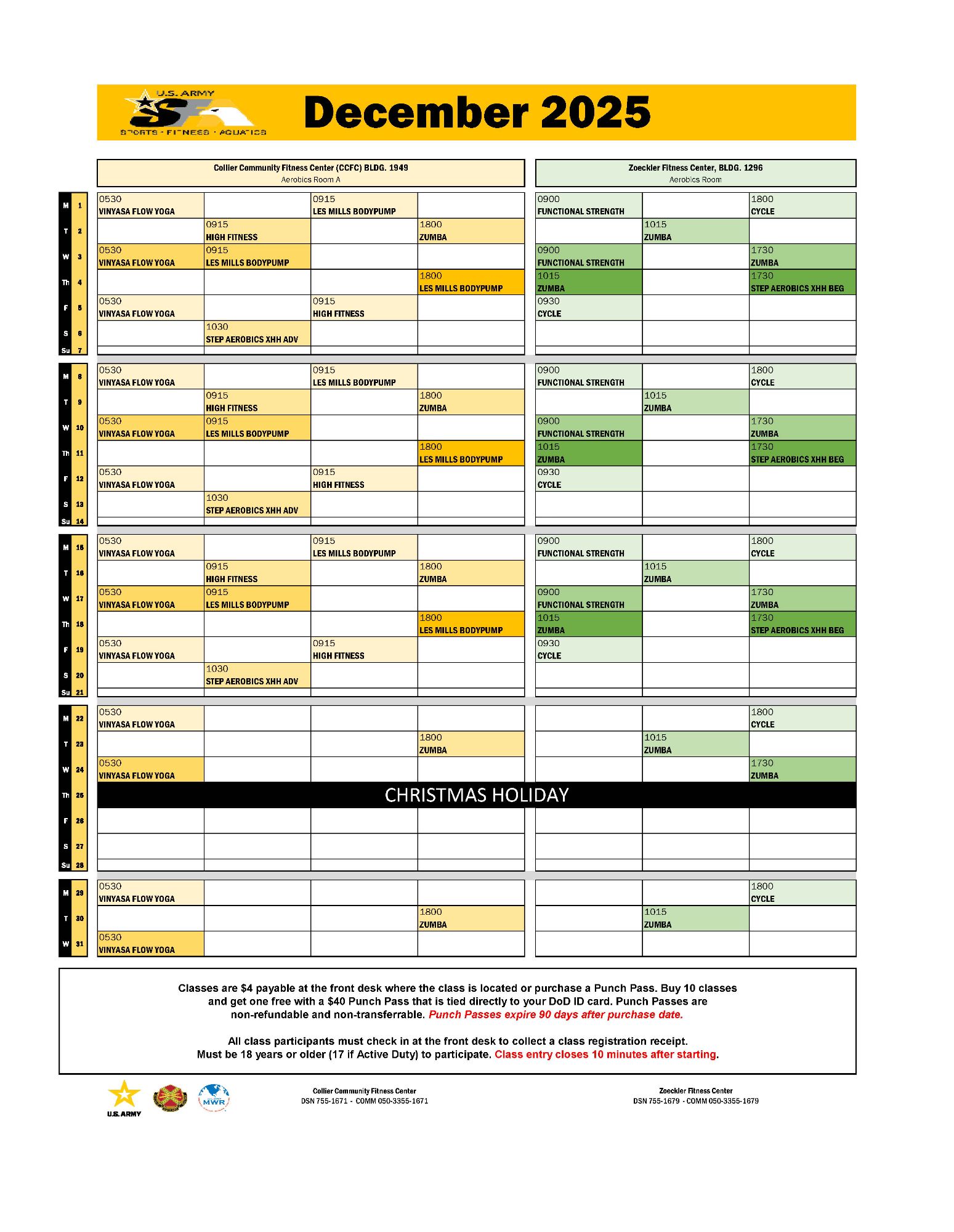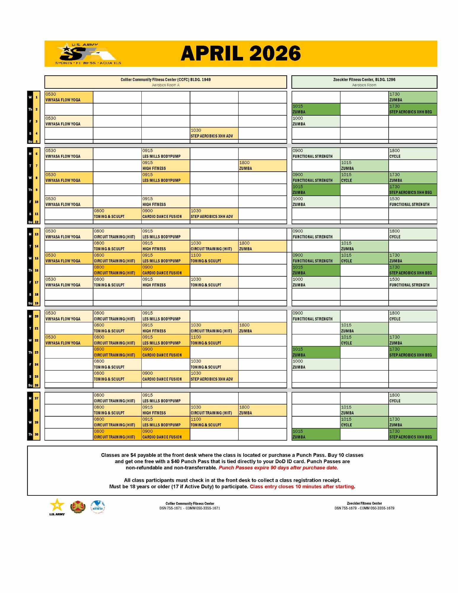 - Patrons must be 18 years of age or older (17 if Active Duty) to participate in classes.
