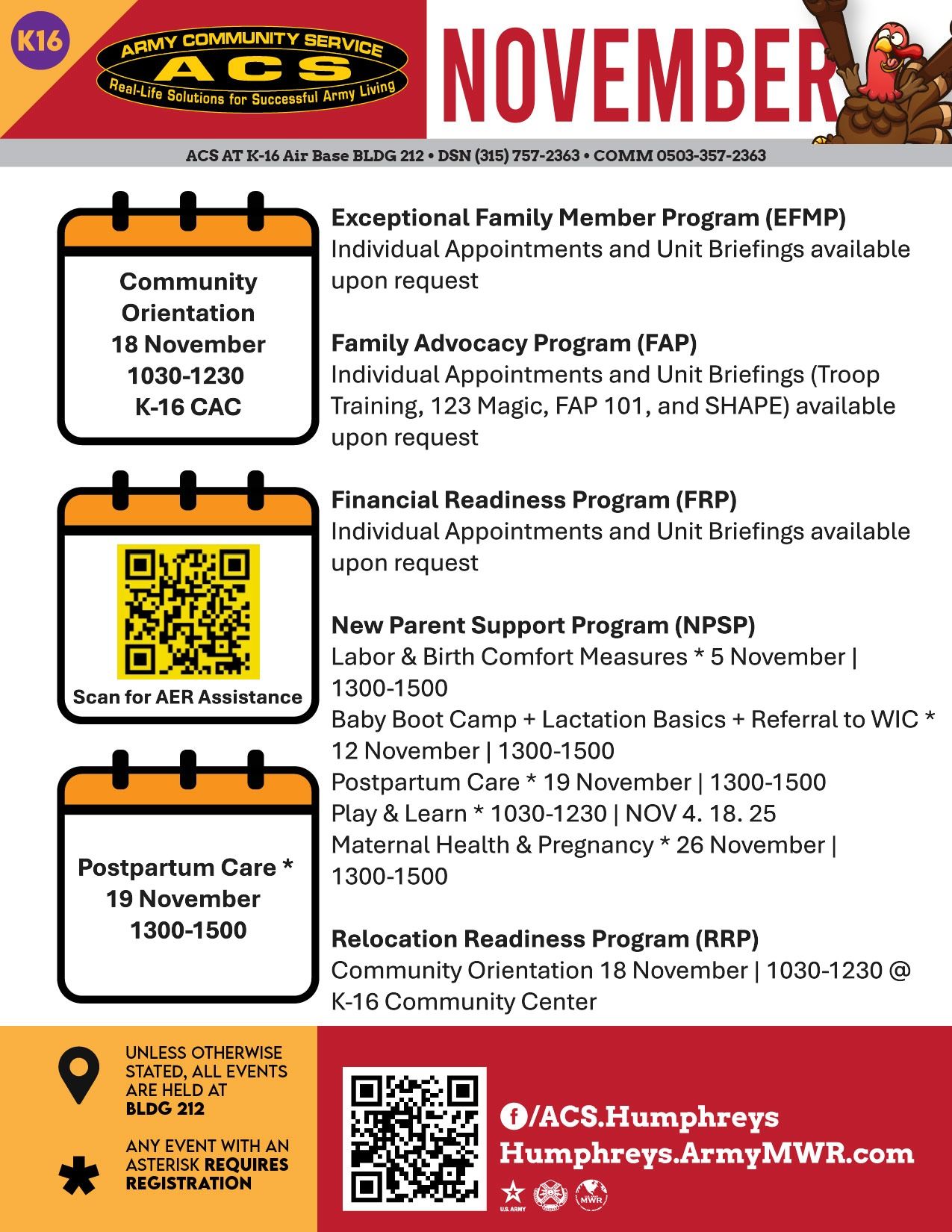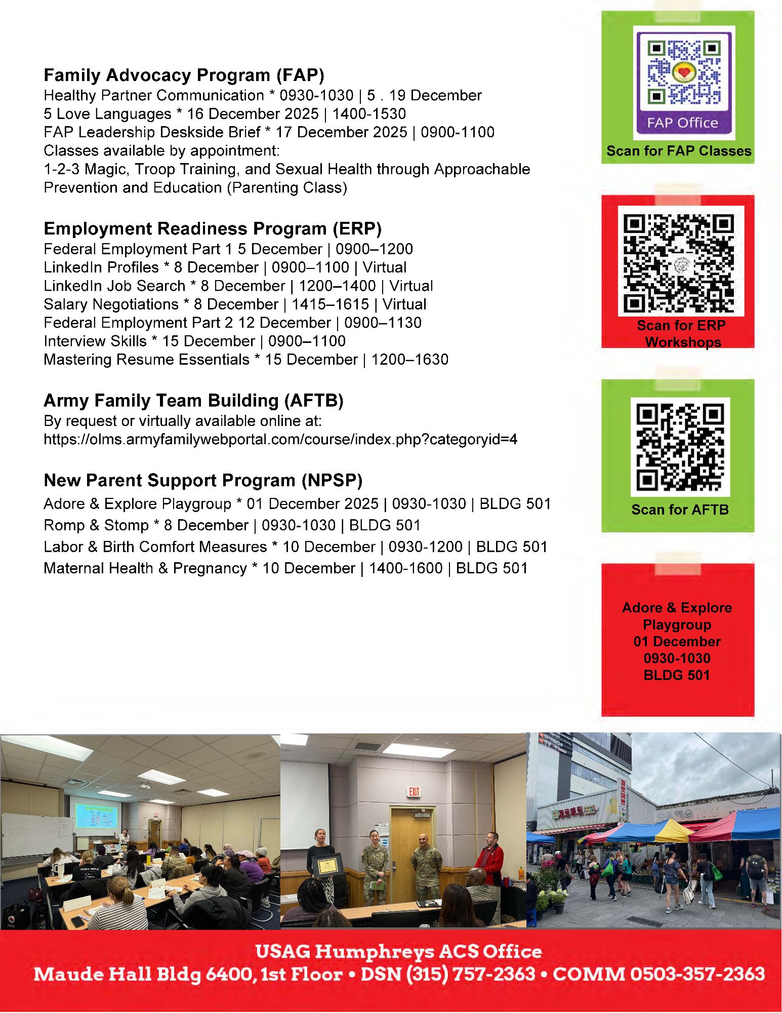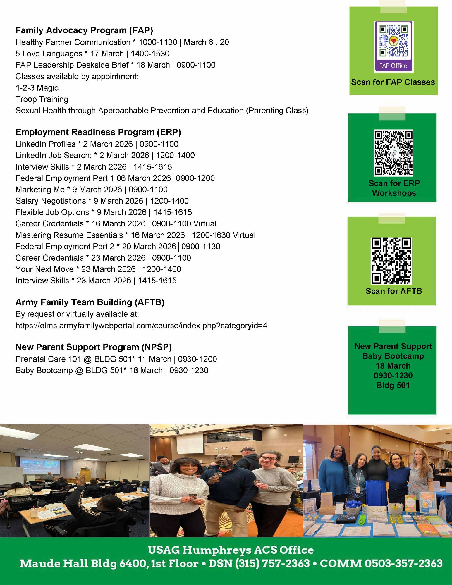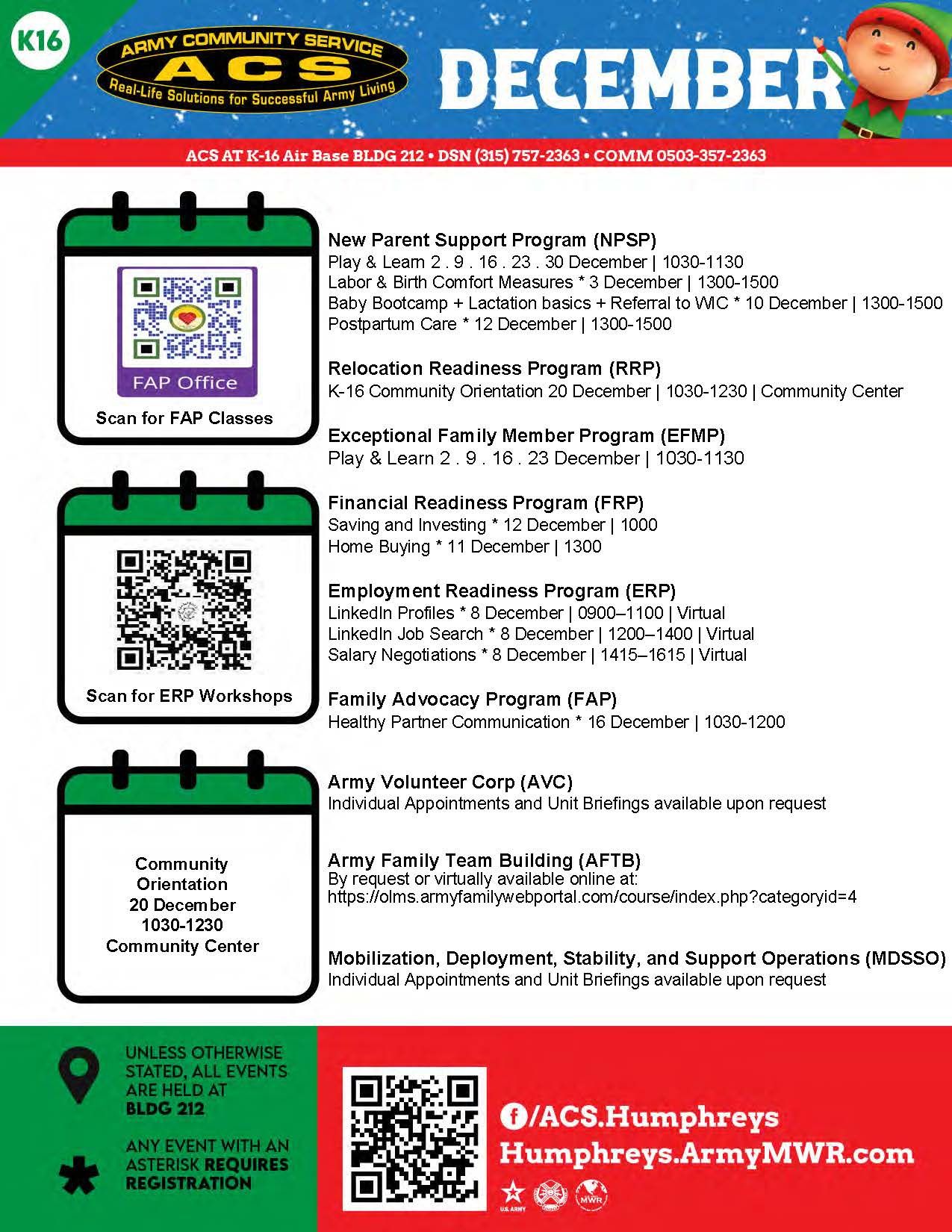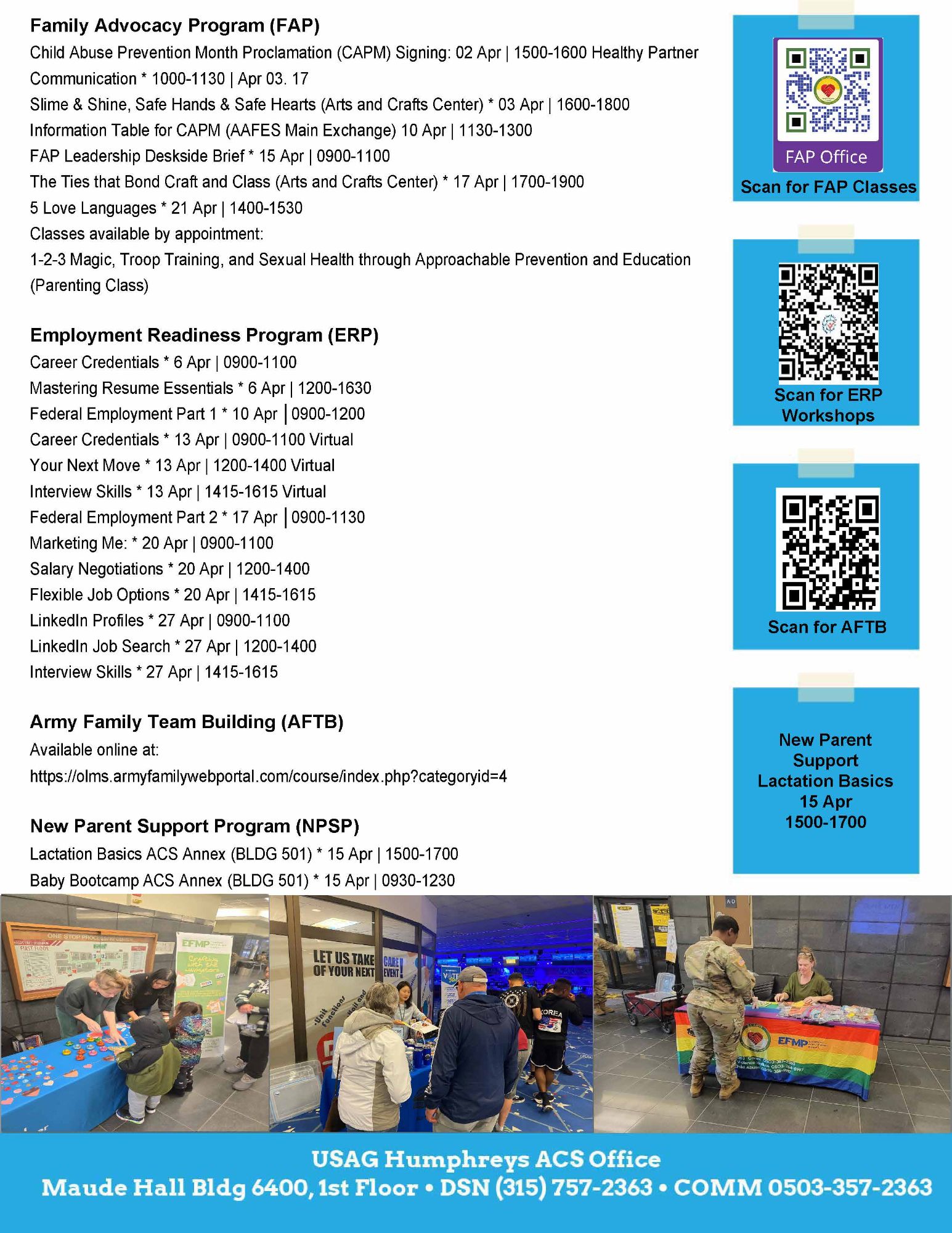 The programs offered are intended to provide support services, education and information to assist Soldiers, Family Members, Retirees and DoD Civilians assigned to USAG Humphreys and K-16 Air Base.