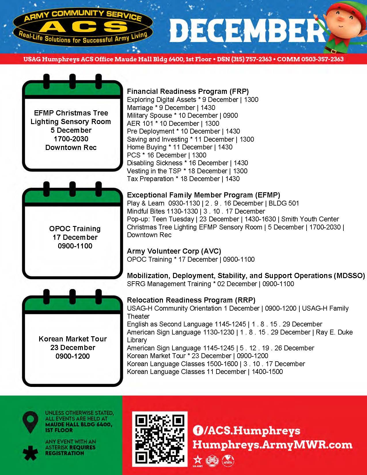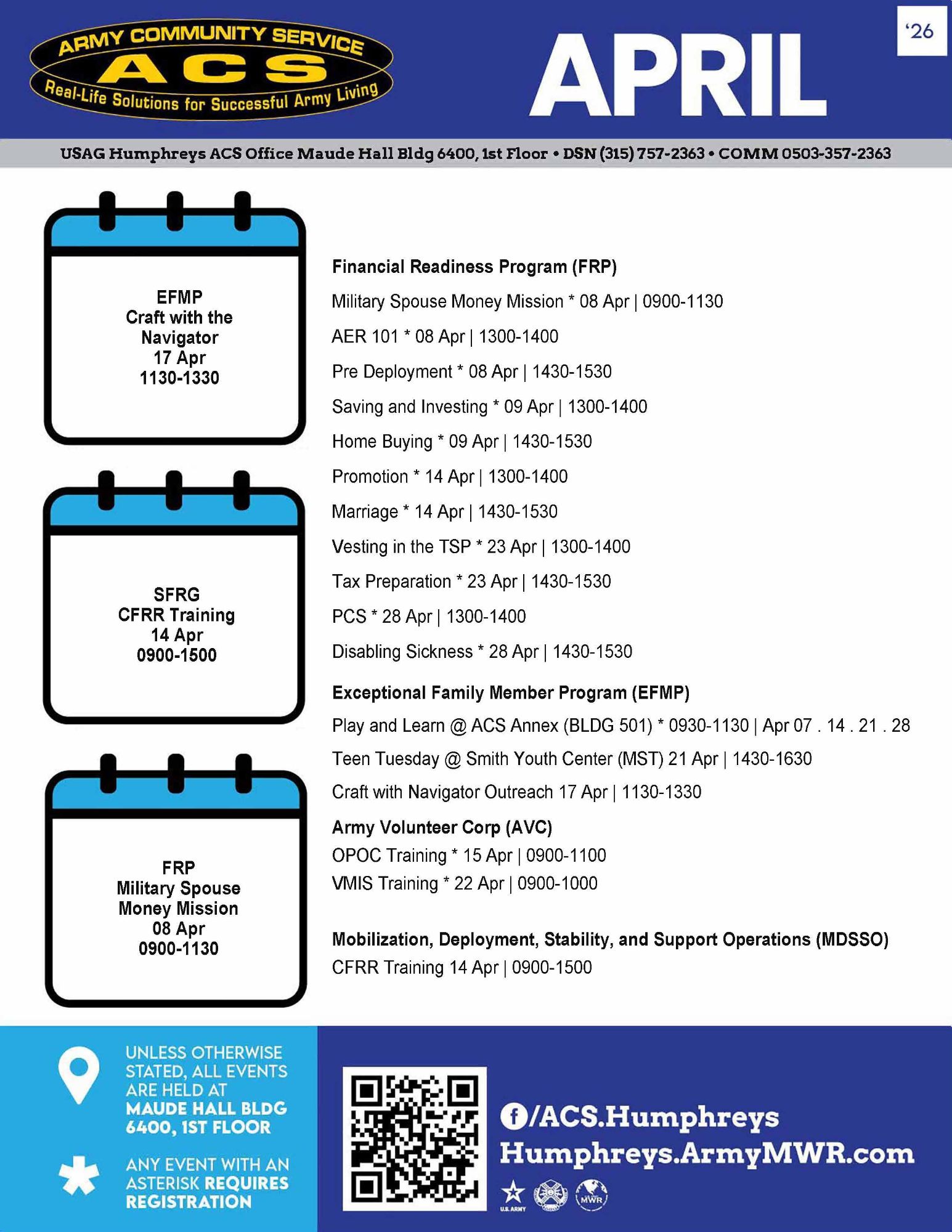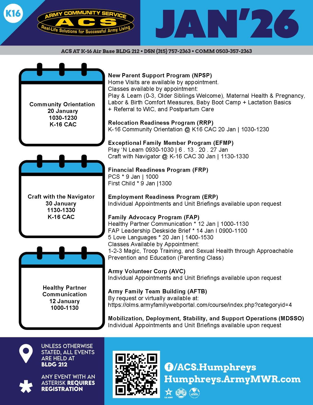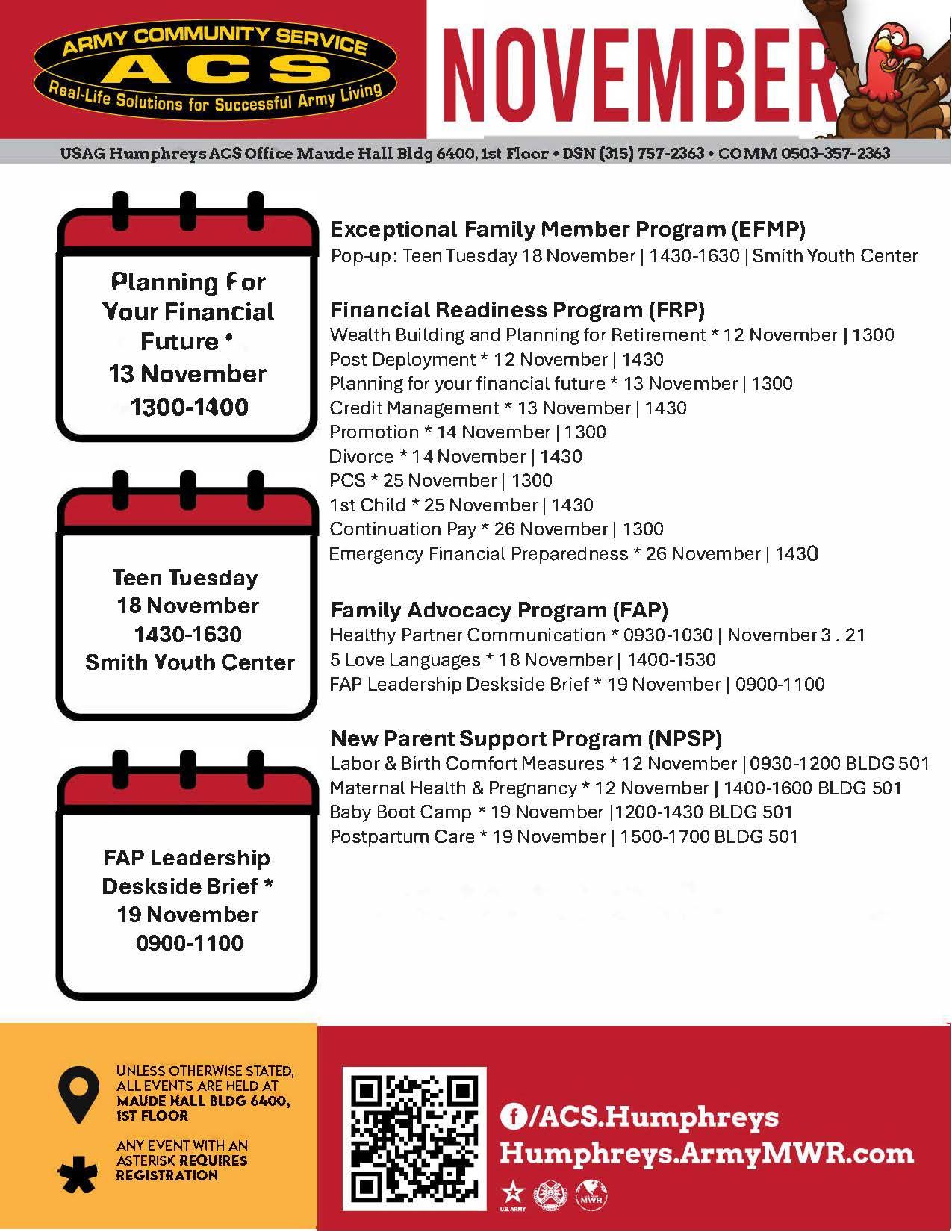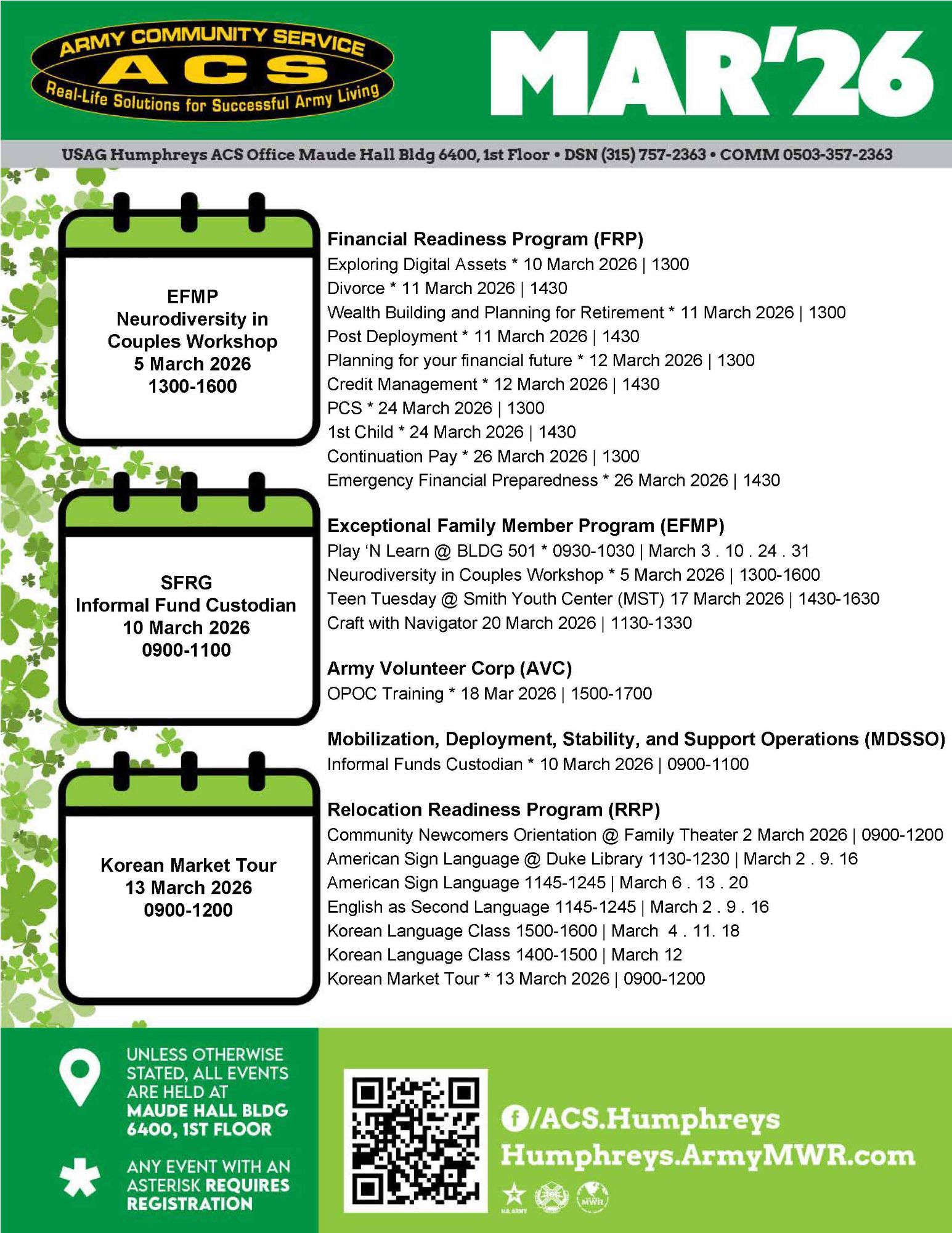 The programs offered are intended to provide support services, education and information to assist Soldiers, Family Members, Retirees and DoD Civilians assigned to USAG Humphreys and K-16 Air Base.