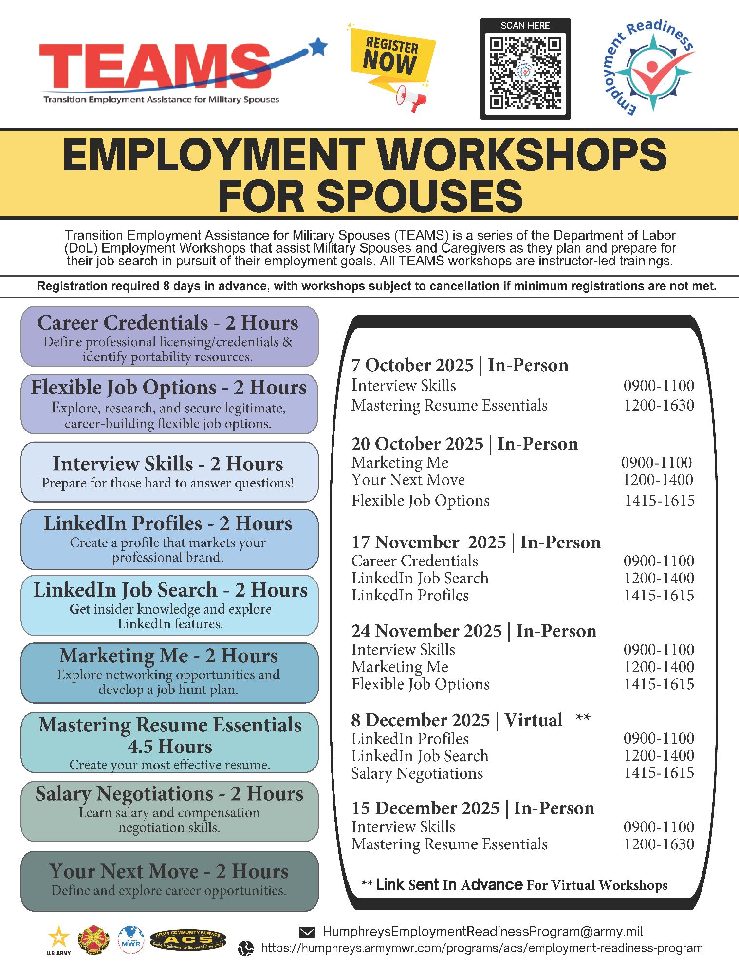 Employment Workshops are facilitated by the Employment Readiness Program (ERP) in partnership with the Department of Labor (DoL) Contract Team and are offered in-person at Camp Humphreys (ACS Classrooms, Maude Hall) or virtually via TEAMS.