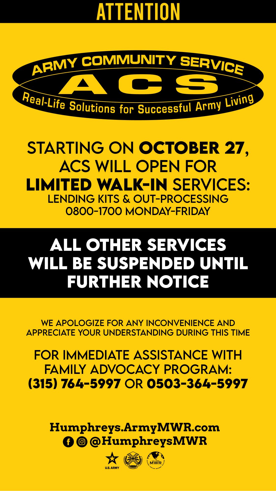 Program Name DSN Number Commercial Number Army Emergency Relief (315)757-2363/2634 +82 (0)50-3357-2363 or +82 (0)50-3357-2634 Army Family Action Plan (315)757-2373 +82 (0)50-3357-2373 Army Family Team Building (315)757-2370 +82 (0)50-3357-2370 Army Volunteer Corps (315)757-2373 +82 (0)50-3357-2373 Employment Readiness Program (315)757-4107 +82 (0)50-3357-4107 Exceptional Family Member Program (315)757-2581 +82 (0)50-3357-2581 Family Advocacy Program (315)757-2365 +82 (0)50-3357-2365 Financial Readiness Program (315)757-2375 +82 (0)50-3357-2375 Information, Referral and Follow-Up (315)757-2363/2372 +82 (0)50-3357-2363 or +82 (0)50-3357-2372 Mobilization and Deployment (315)757-2370 +82 (0)50-3357-2370 Relocation Readiness (315)757-2362 +82 (0)50-3357-2362 Soldier & Family Readiness Group (315)757-4105 +82 (0)50-3357-4105 Survivor Outreach Services (315)757-2371 +82 (0)50-3357-2371