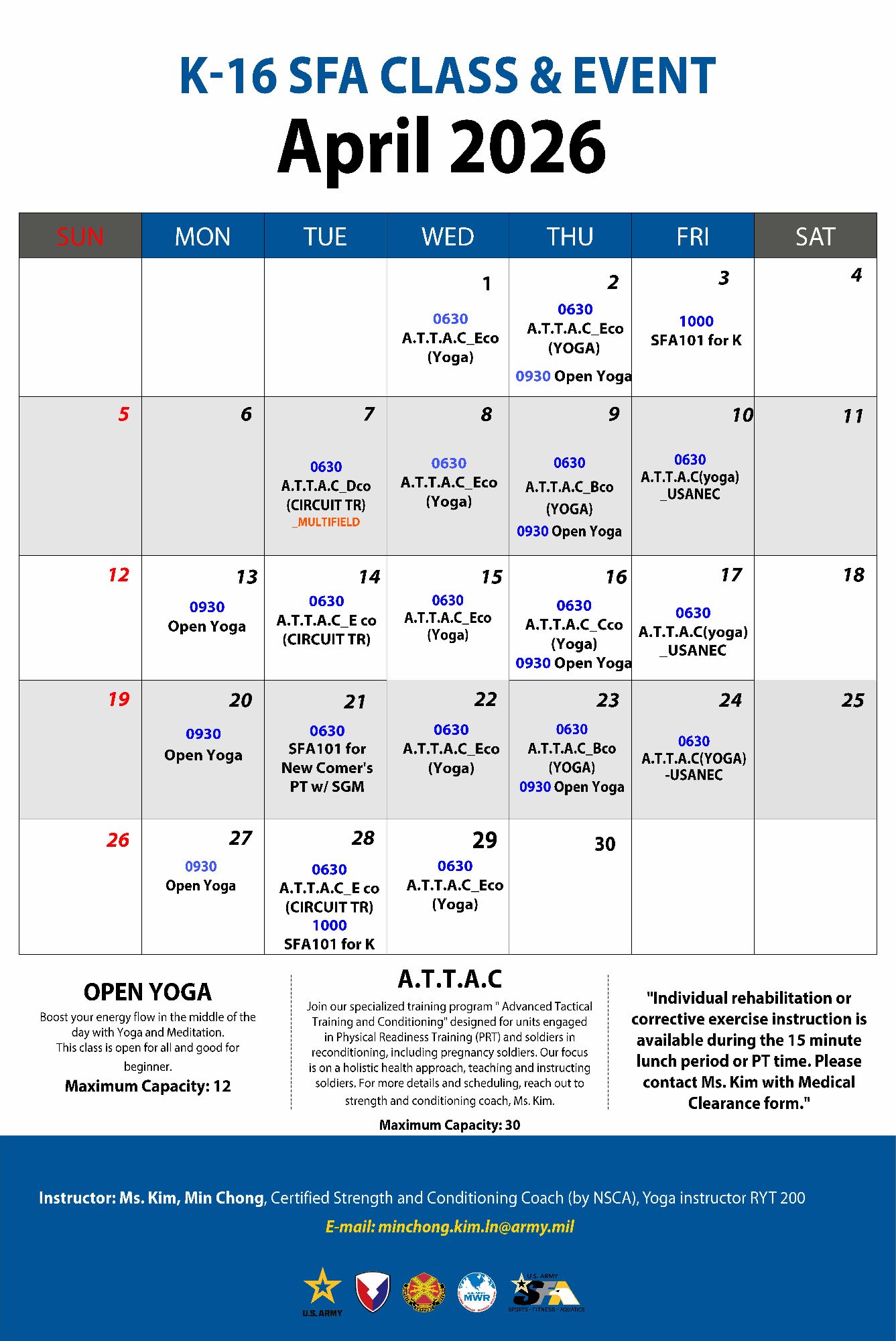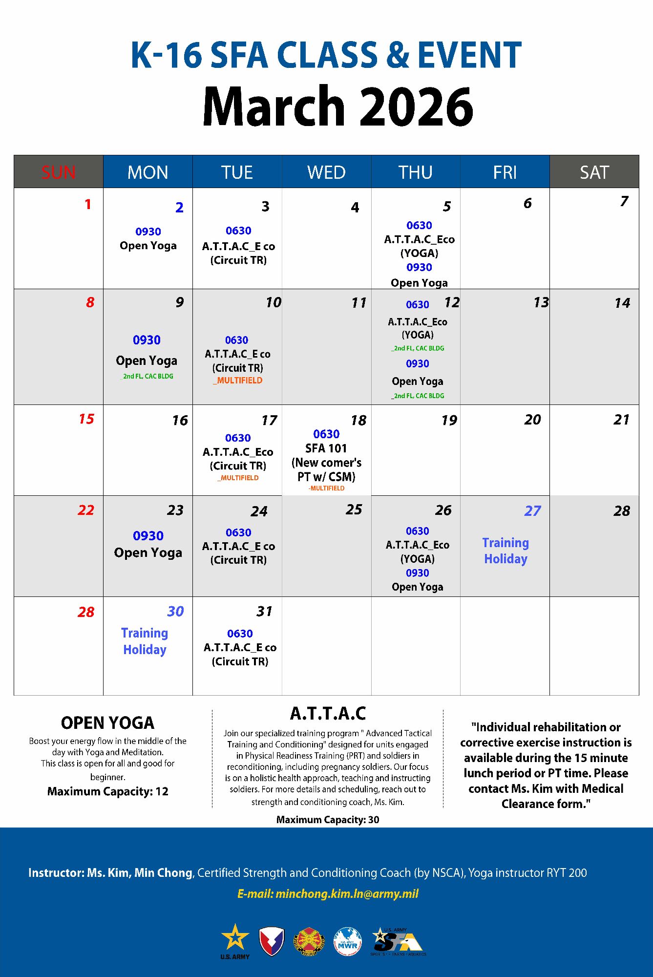 In addition to its fitness amenities, K16 offers various intramural sports programs and fitness classes to support H2F. Advanced Tactical Training & Conditioning (A.T.T.A.C) for unit, Biomechanical Assessment for profile soldiers and Yoga class for community by Certified strength & conditioning coach with Yoga RYT 200hrs.