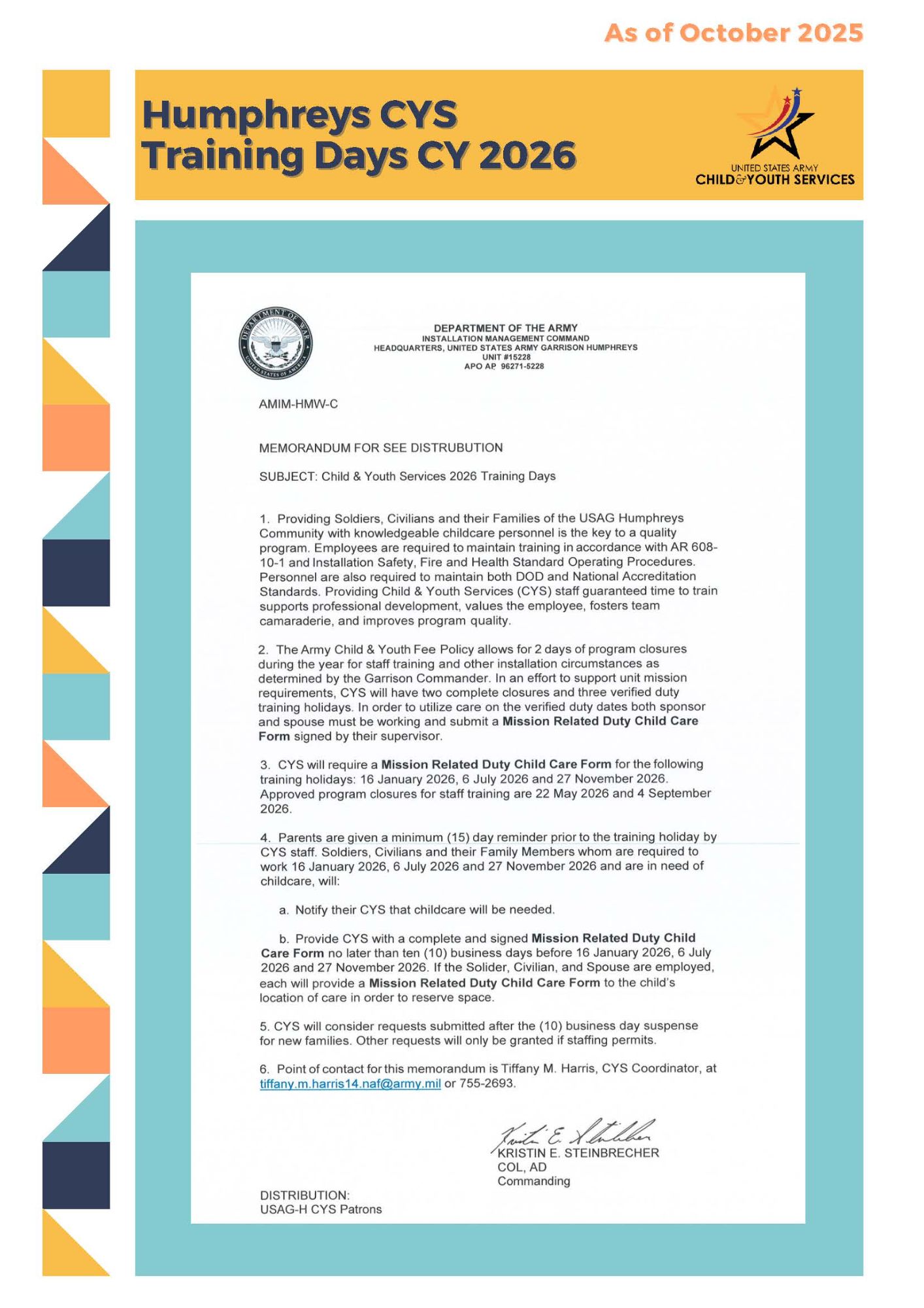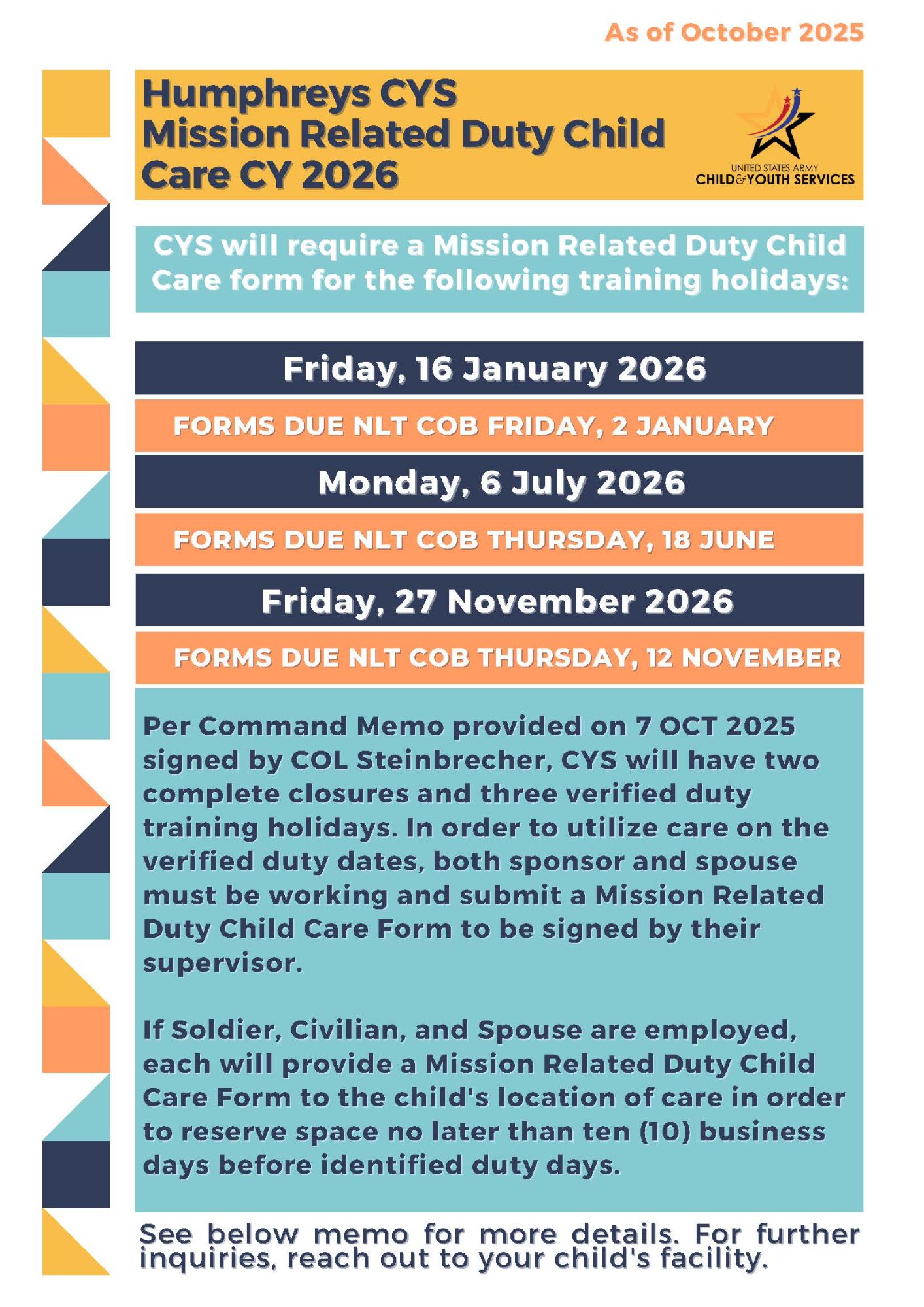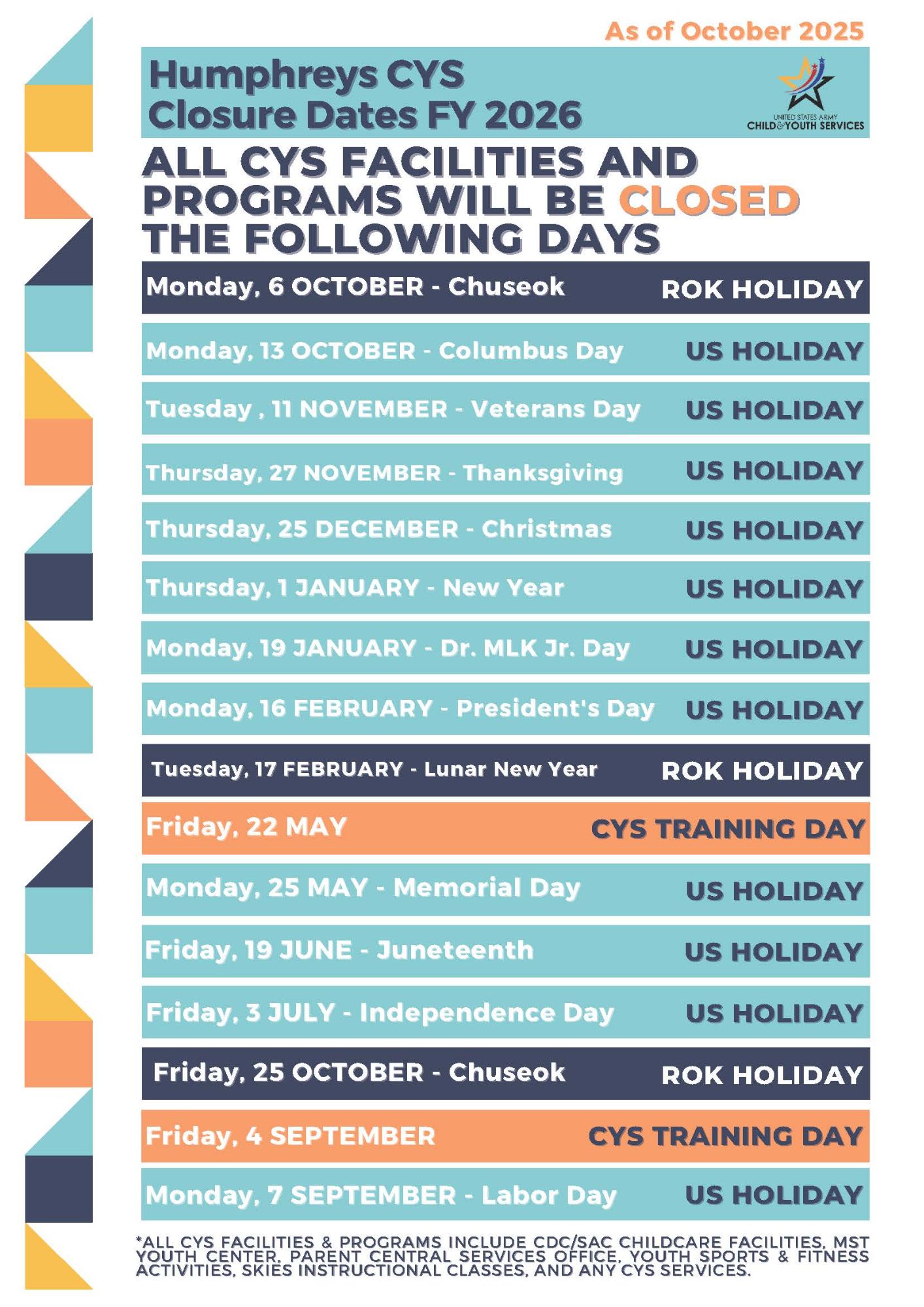 - CYS Training Days and Mission Related Duty Child Care Days (2025/26 Closures)